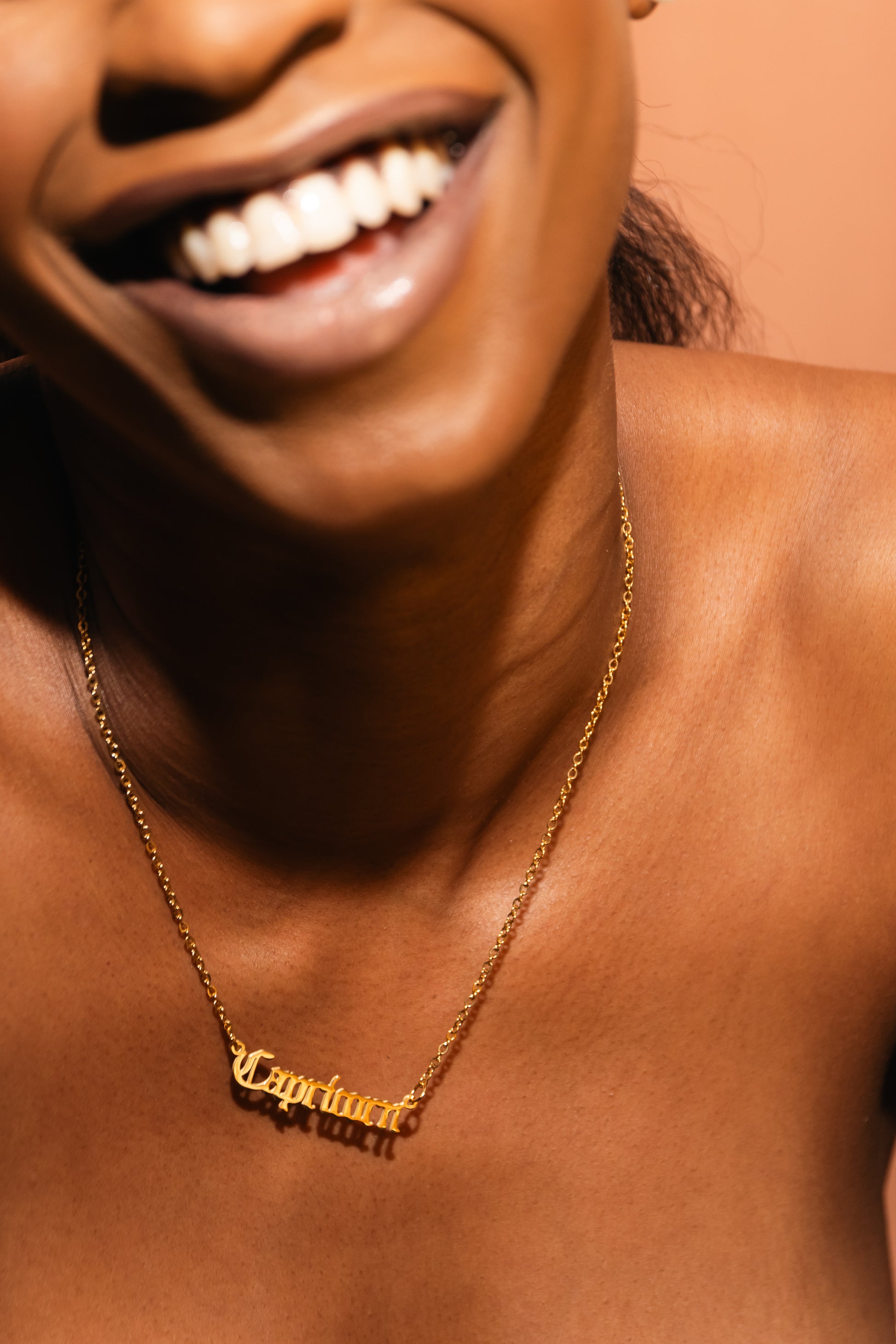 Elevate your look with this Gold Zodiac Nameplate Necklace, designed for bold, confident women who love to shine. Crafted in a timeless Old English font, each piece proudly displays your zodiac sign—whether you're a fiery Leo, a magnetic Scorpio, or a free-spirited Aquarius.